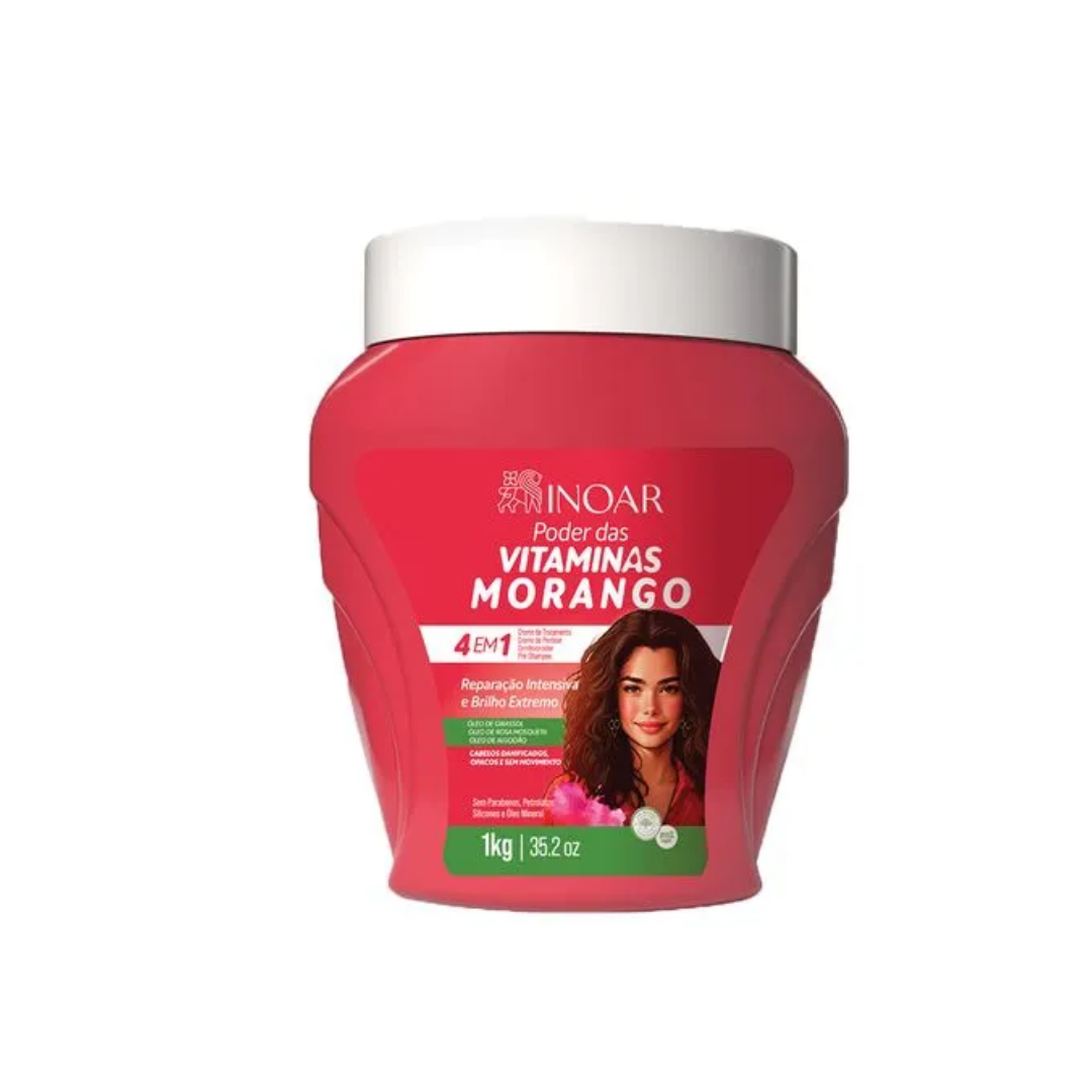 La Crema de Fresa 4 en 1 de Inoar fue especialmente formulada con una mezcla de aceites ricos en antioxidantes y ácidos grasos que hidratan y nutren intensamente el cabello.